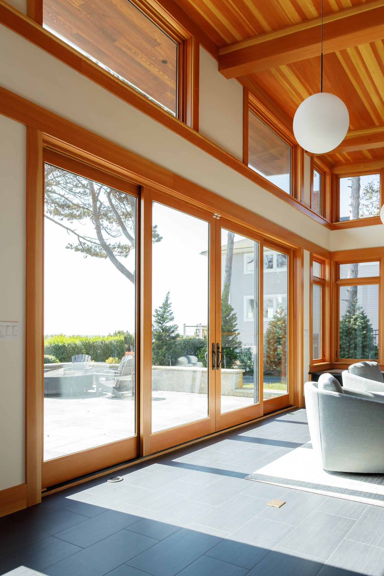 To maintain a cohesive look, the home features TruStile CVG Fir doors paired with Marvin transoms, both supplied by Grand Banks Building Products. These details create visual harmony and a sense of flow throughout the home. The addition’s Marvin Signature Ultimate windows also with CVG interior finish, frame panoramic views of the Atlantic at every angle while filling the rooms with natural light. A custom Marvin uneven three window mulled unit flanks the entry staircase and adds a touch of dramatic appeal to an otherwise minimalist foyer while Marvin Signature sliding doors seamlessly open the living and dining areas to the outdoors, embracing the best of coastal living on the North Shore.
