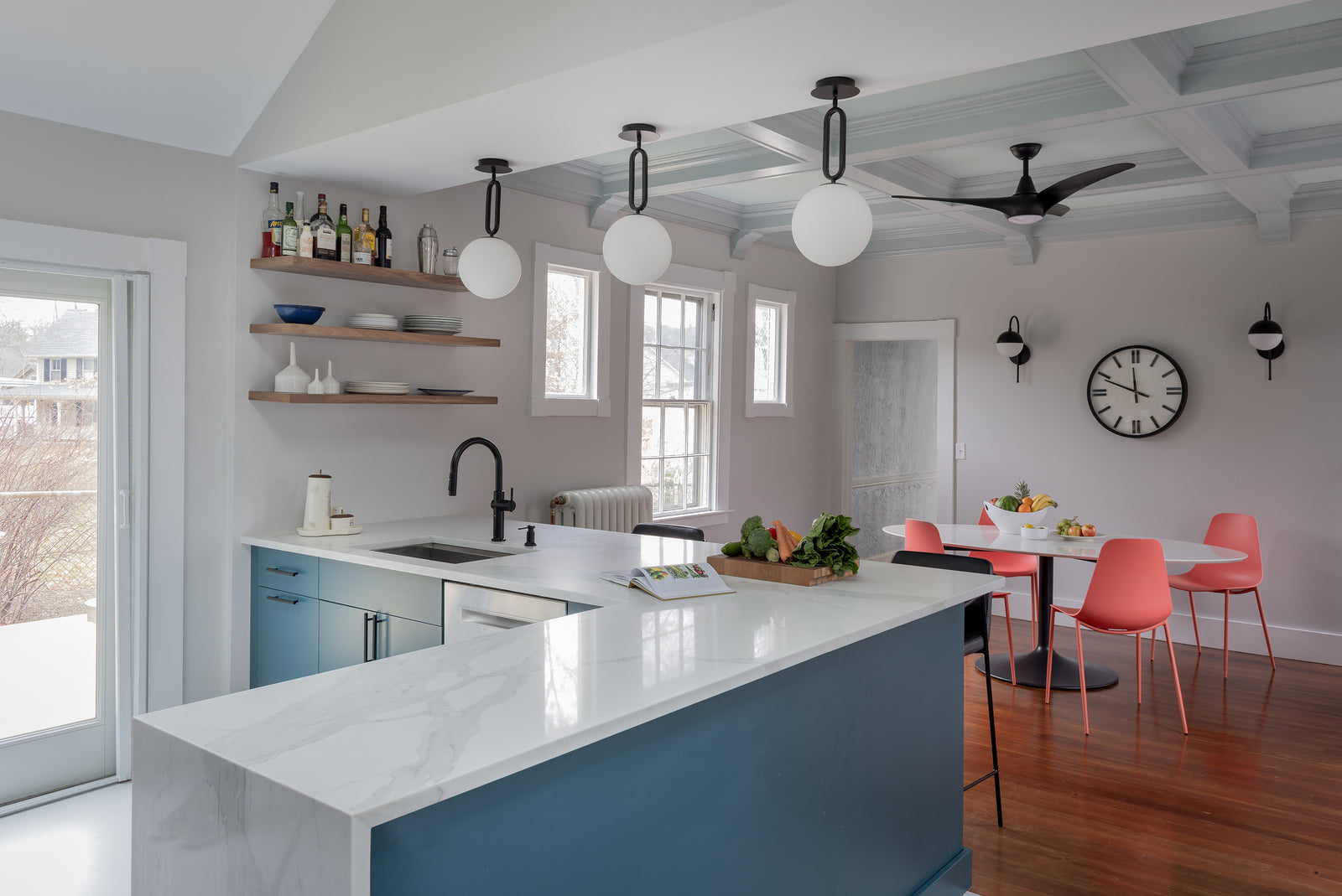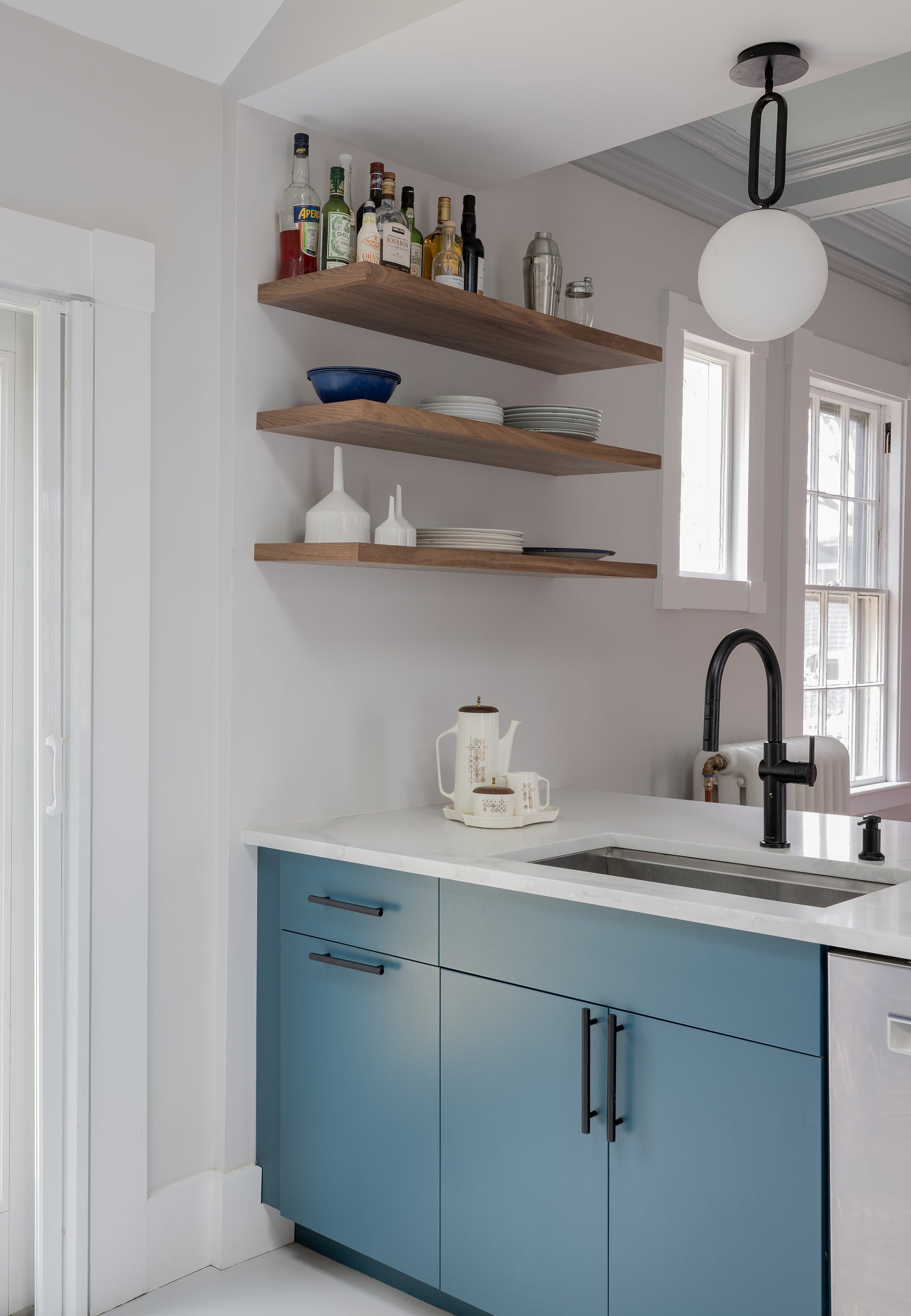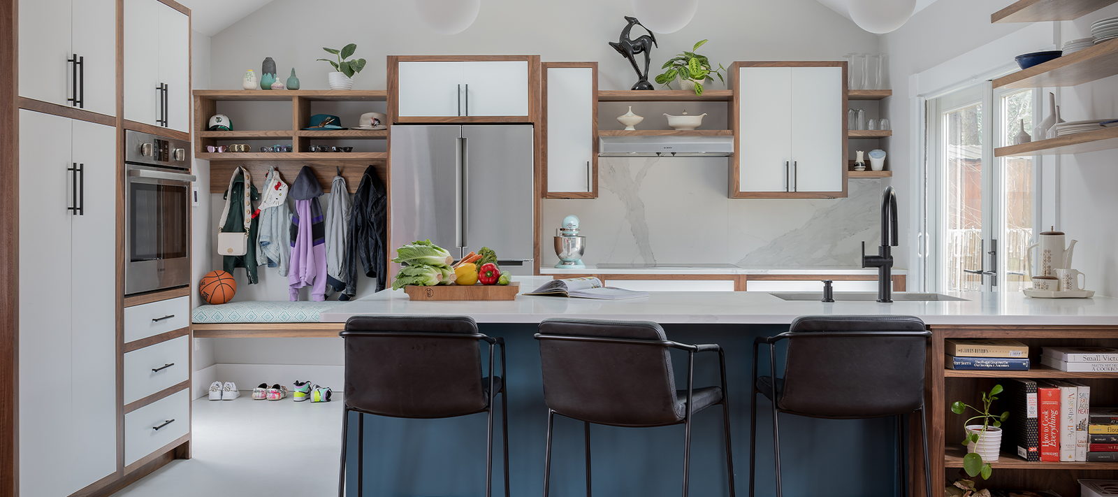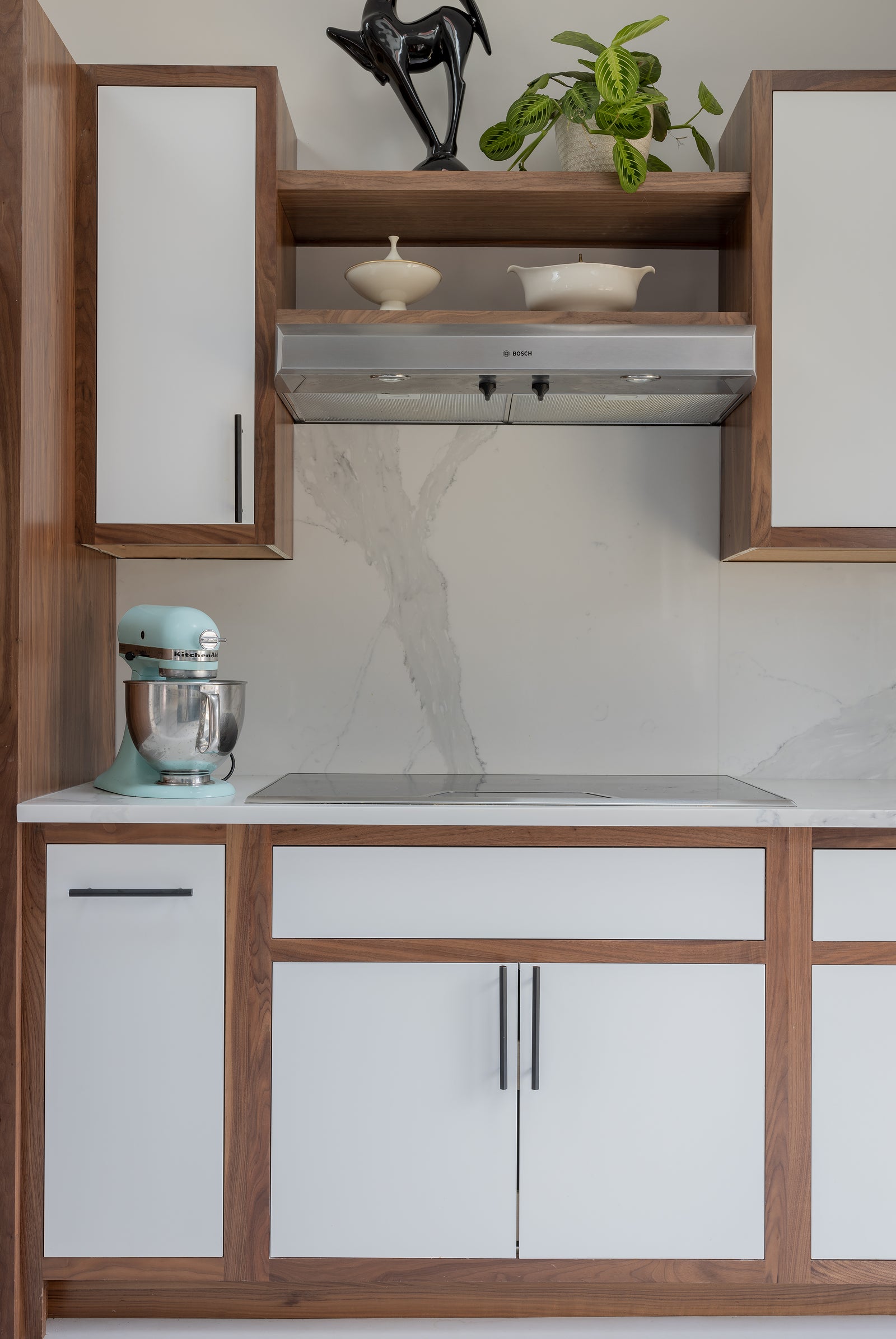 Flush Inset Perimeter Cabinetry Door Style: Manhattan, Finish: Painted Arctic Doors / Natural Stained Faceframe , Species: MDF / Walnut